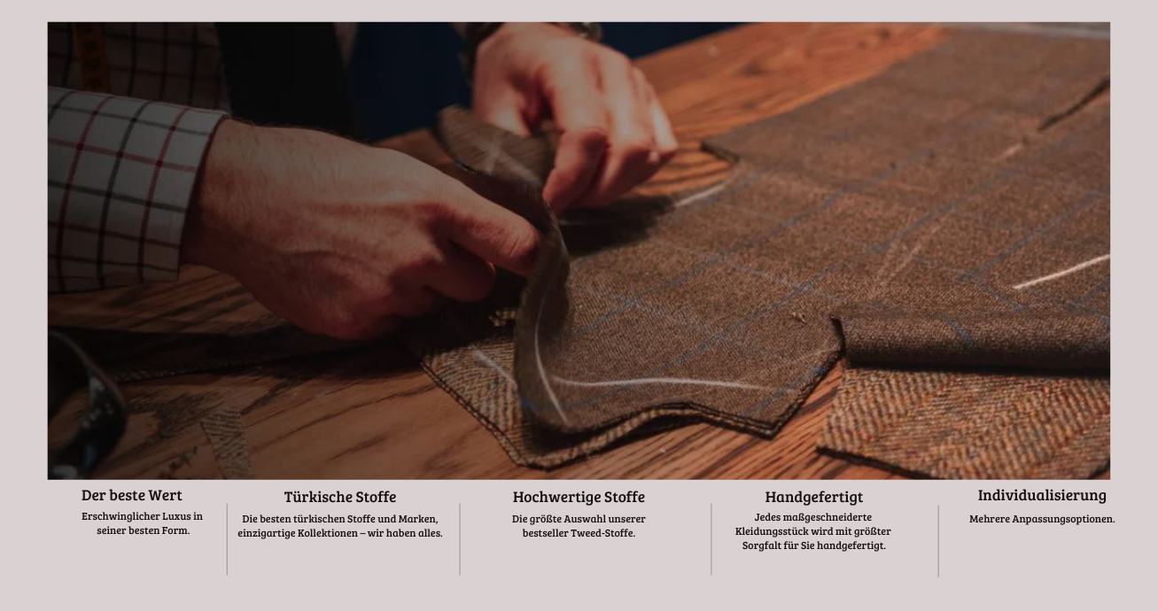Maßgeschneiderte Anzüge, Jacken, Hosen und mehr, gefertigt aus hochwertigen Stoffen, darunter österreichische und türkische Textilien.